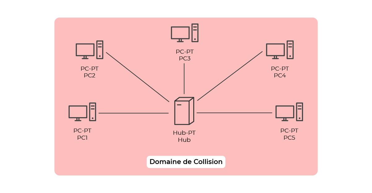 | Domaine de collision | Segment réseau où les périphériques sont en concurrence pour l’accès au support partagé. Si deux appareils transmettent à la fois, une collision se produit. | Sur un hub, chaque port est dans le même domaine. |