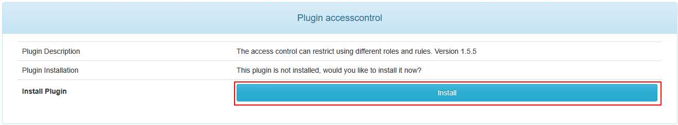 Aller dans Plugins > Install Plugins, cliquer sur le plugin accesscontrol, puis cliquer sur Install.