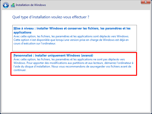 - Choisir le type d’installation : sélectionner « Personnalisée » pour une nouvelle installation