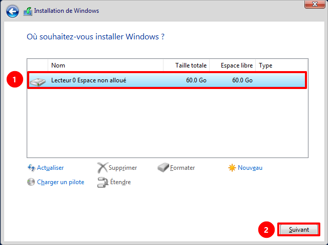- Sélectionner le disque sur lequel installer Windows Server, puis cliquer sur « Suivant »