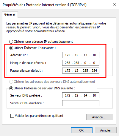 - Dans les propriétés TCP/IPv4, définir une adresse IP statique, un masque de sous-réseau, une passerelle et un DNS