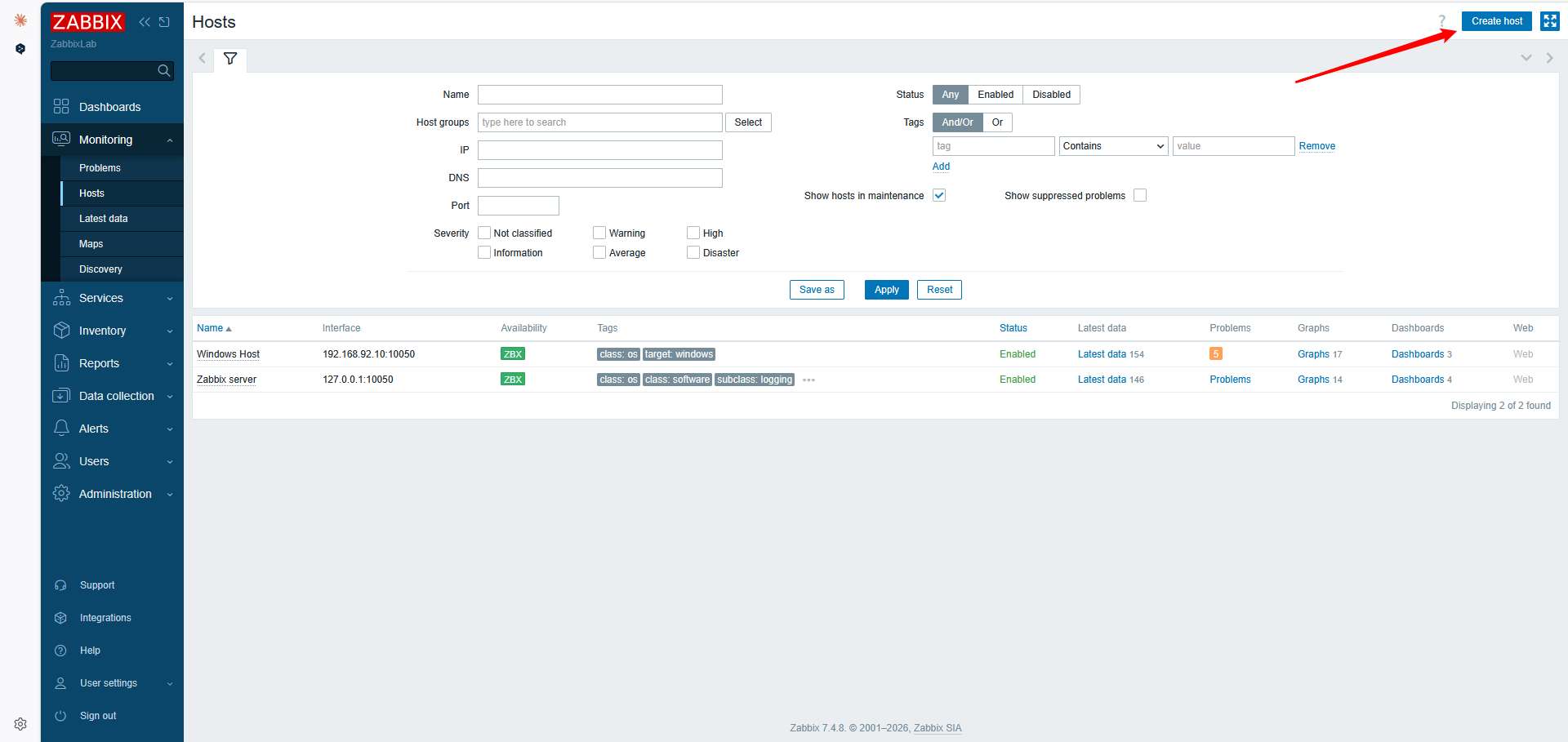 Aller dans Monitoring > Hosts puis cliquer sur Create Host