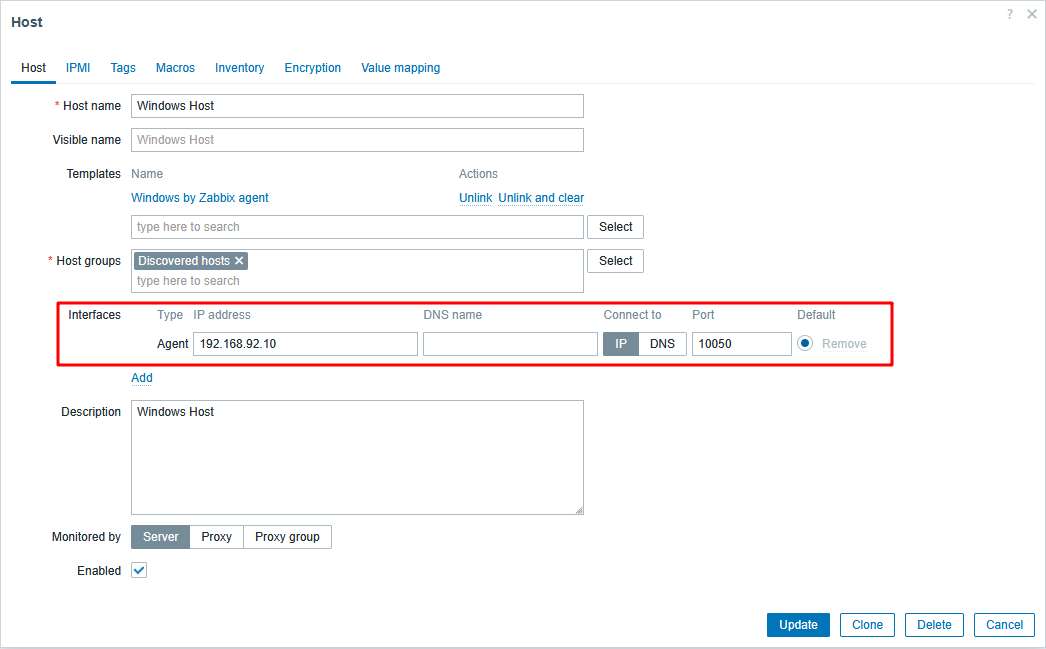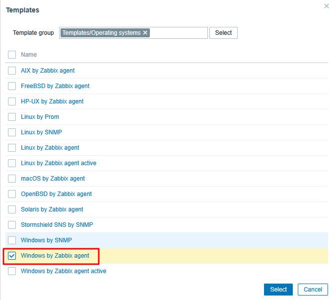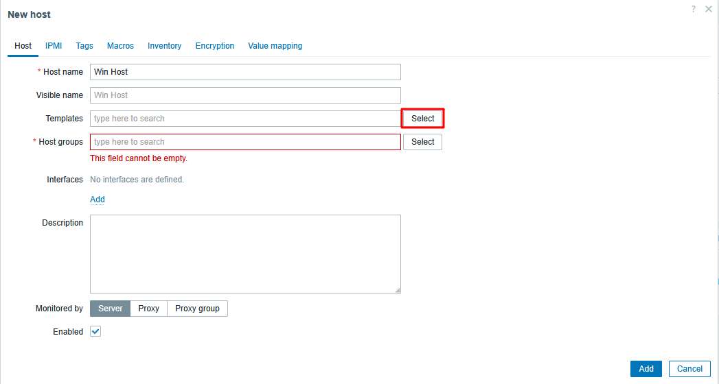 Sélectionner également un Host GroupCliquer sur AddSélectionner Agent puis renseigner l’adresse IP du système à surveiller qui contient un agent Zabbix.Il est important de mettre le même port d’écoute que l’agent installé précédemment. | ![]() |