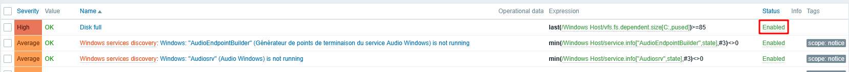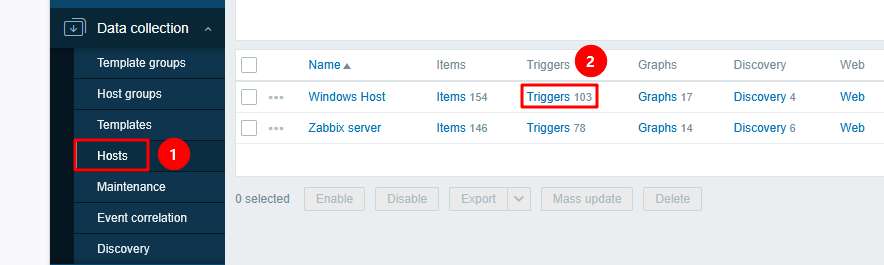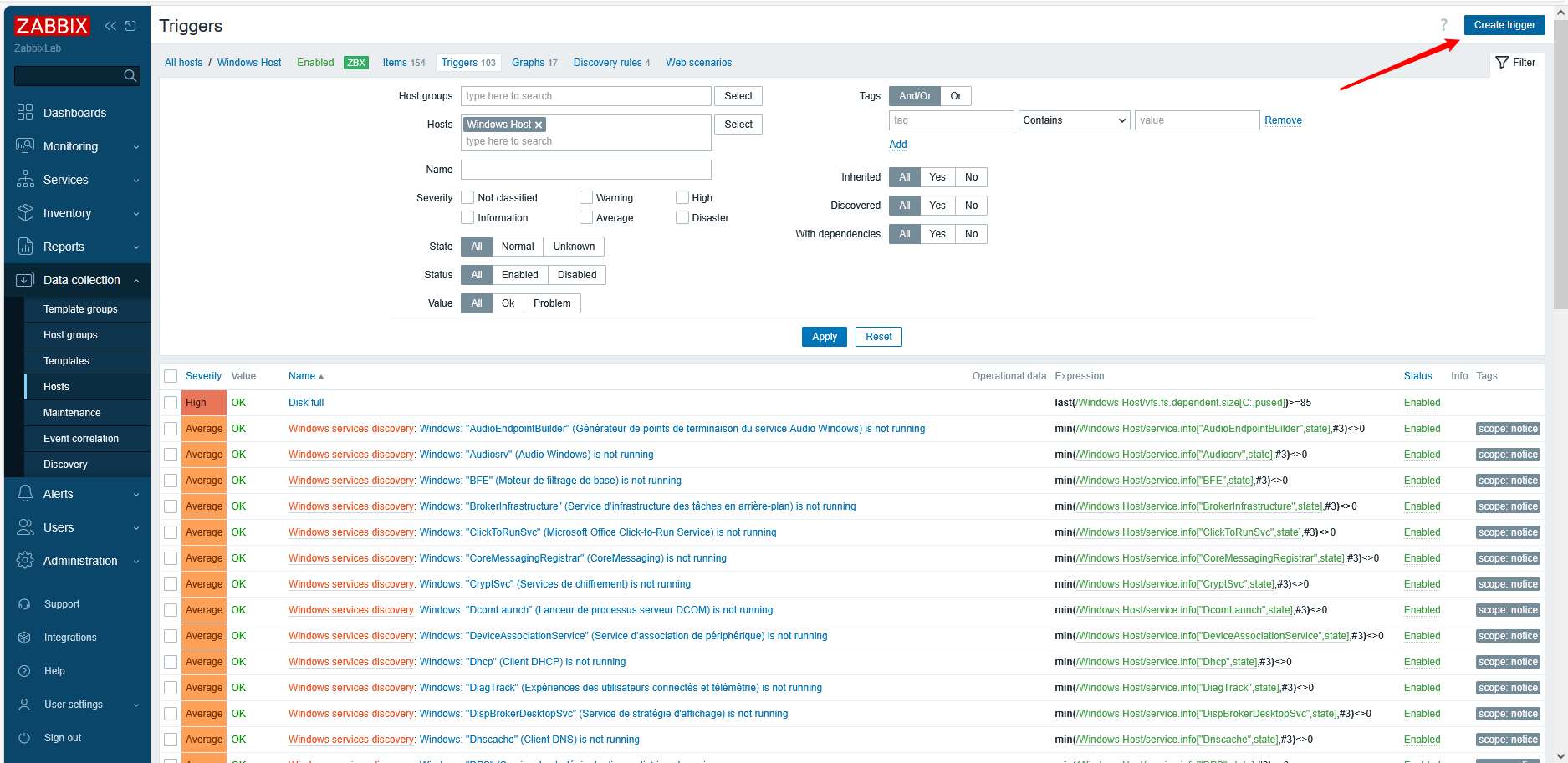 Dans Data collection > Hosts , cliquer sur Triggers sur la ligne d’un hôte pour accéder a tous les déclencheurs actif.