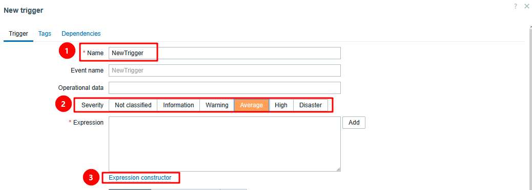 Renseigner le nom du nouveau déclencheur, sa sévérité, puis pour simplifier la mise en place d’une expression, cliquer sur Expression constructor