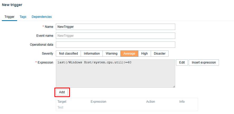 Une fois l’expression établie, cliquer sur Add pour l’ajouter à la liste des expression à prendre en compte pour le déclenchement.